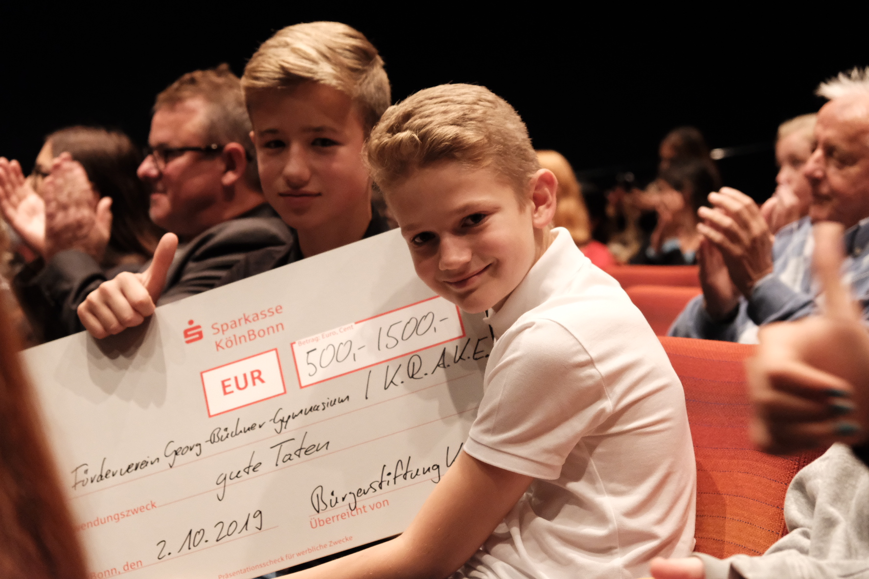 Dieses tolle Engagement lobte Laudatorin Diana zu Löwen ebenso ausdrücklich wie das Talent der Jugendlichen, die entscheidenden Likes bei Facebook und YouTube für ihren Beitrag zu sammeln. Die Influencerin rief alle Teilnehmenden dazu auf, ihre Projekte in den sozialen Medien zu teilen. So könnten sie schließlich eine bestmögliche Breitenwirkung erzielen und zum Nachahmen anregen. Das Stichwort „Teilen“ griffen die Gewinner*innen bereits beim Preisgeld auf: Sie teilten das Preisgeld fair zwischen der K.R.A.K.E. und dem Förderverein ihrer Schule, dem Georg-Büchner-Gymnasium in Köln-Weiden, auf.
