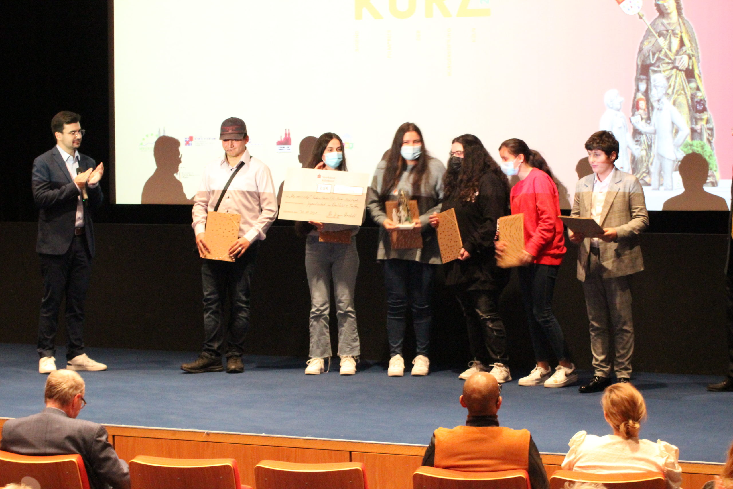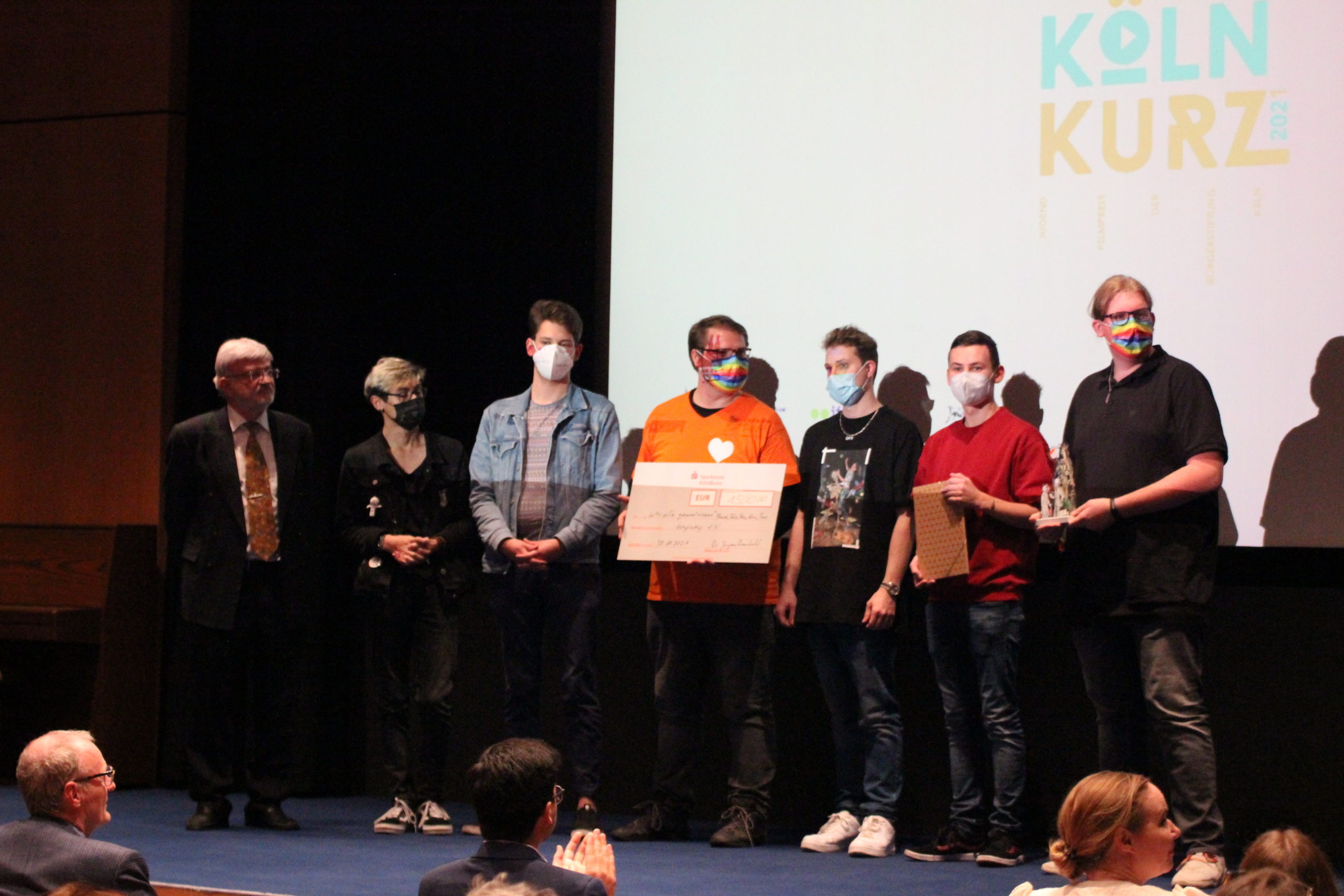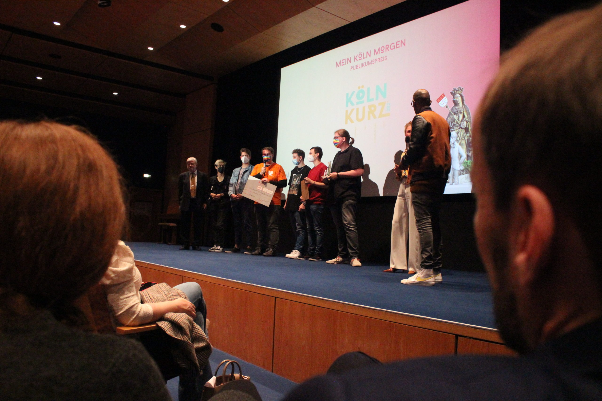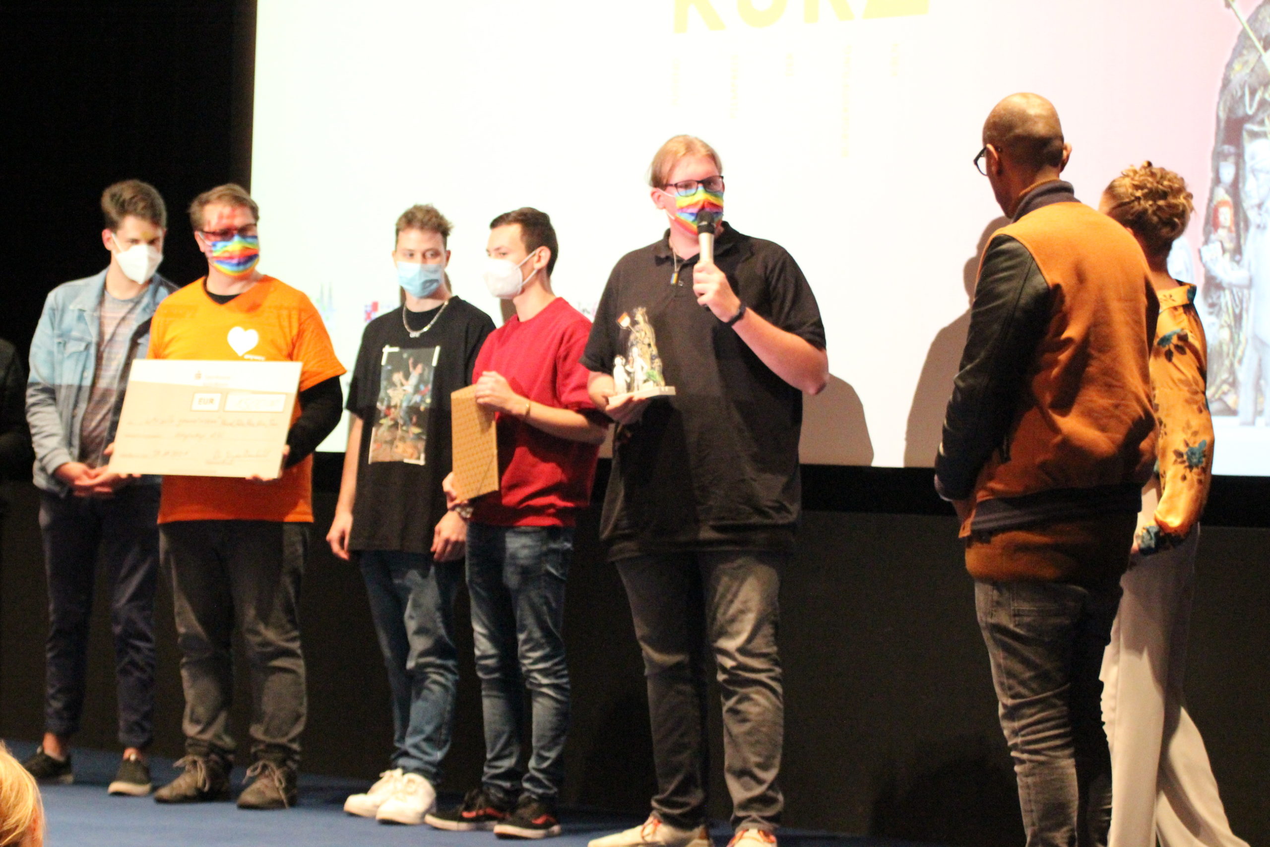 Fernsehmoderator Amiaz Habtu, Mitglied der Jury bei „Köln Kurz 2021“, überreichte den Publikumspreis an den Beitrag „Wir alle gemeinsam“ von Marcel, Felix, Max, Nina und Tom. Ihre Vision für „ihr“ Köln morgen ist eine Stadt, in der niemand aufgrund seiner sexuellen Orientierung oder geschlechtlichen Identität ausgegrenzt oder benachteiligt wird.