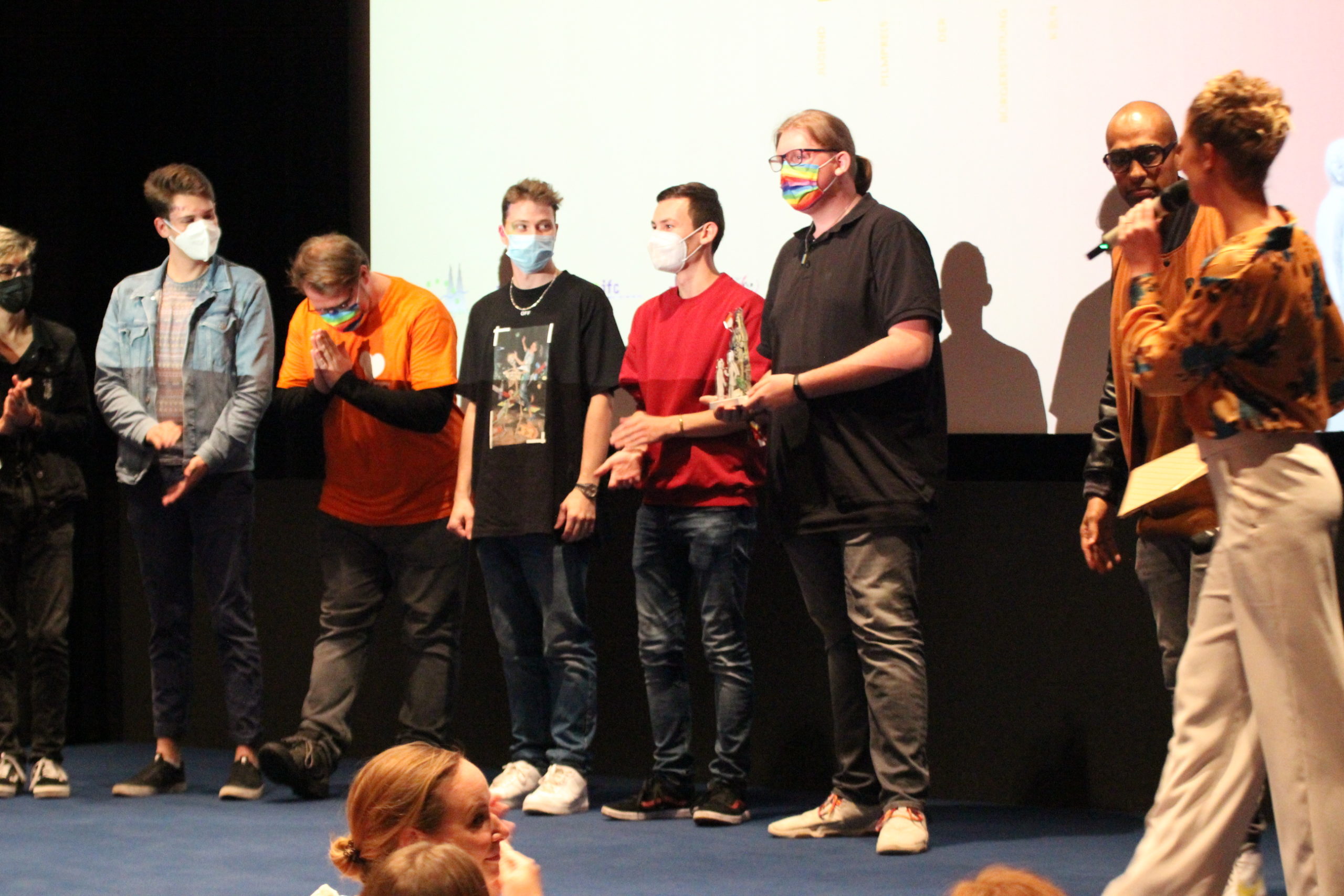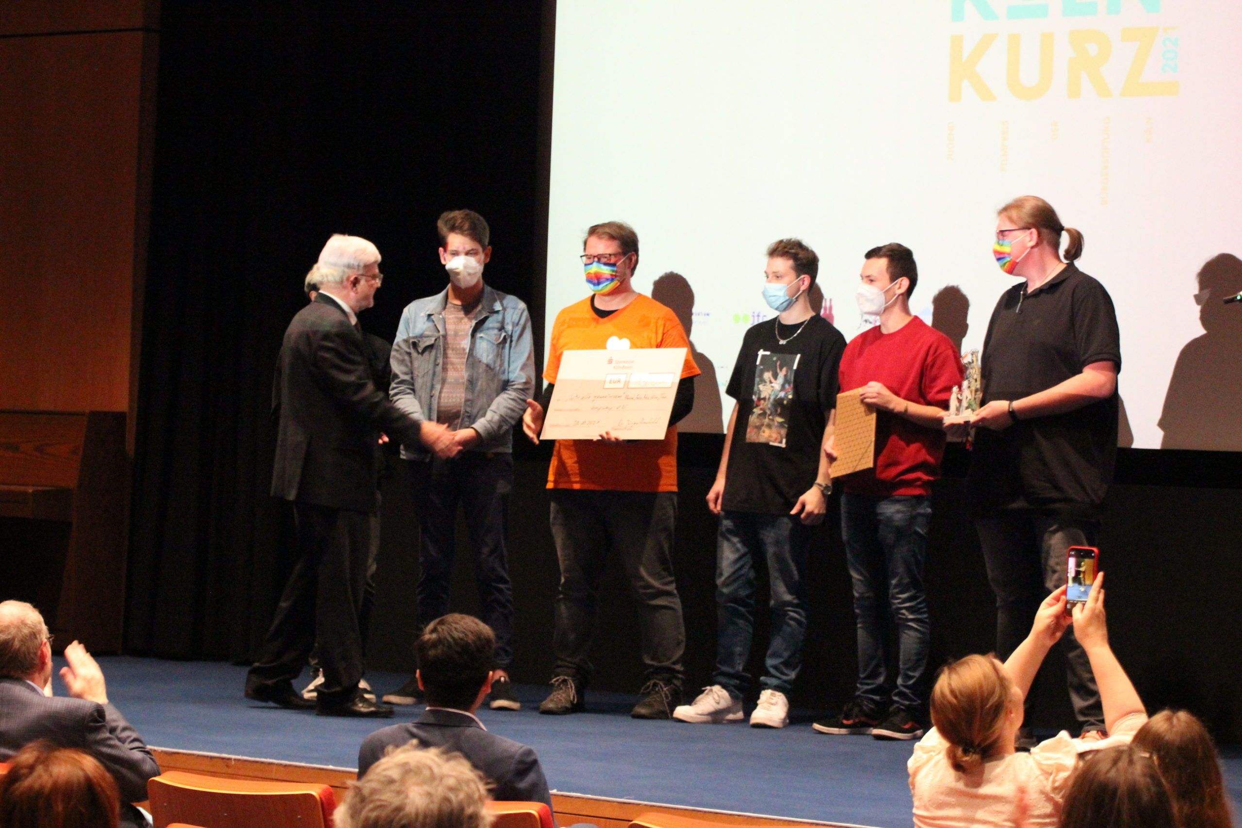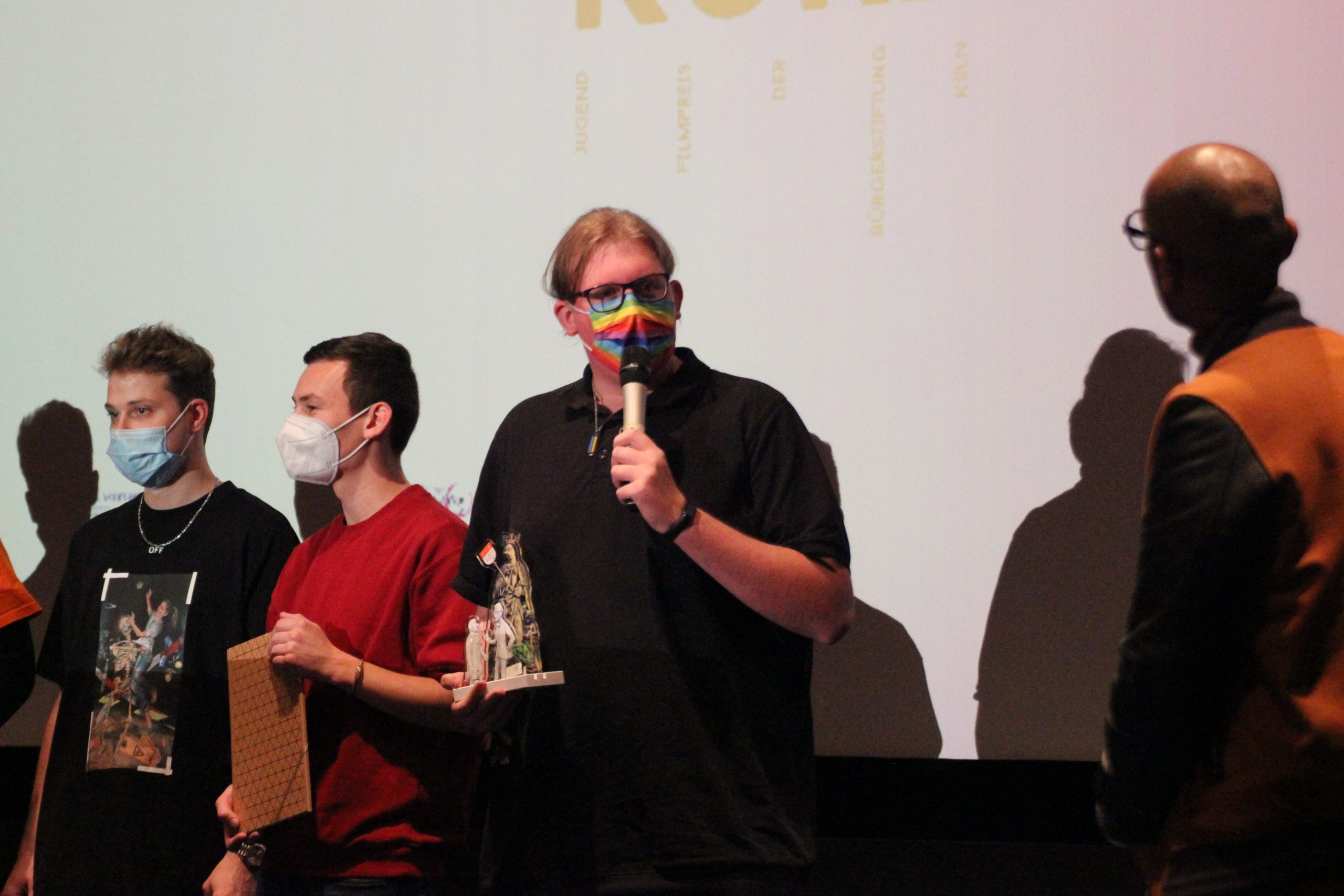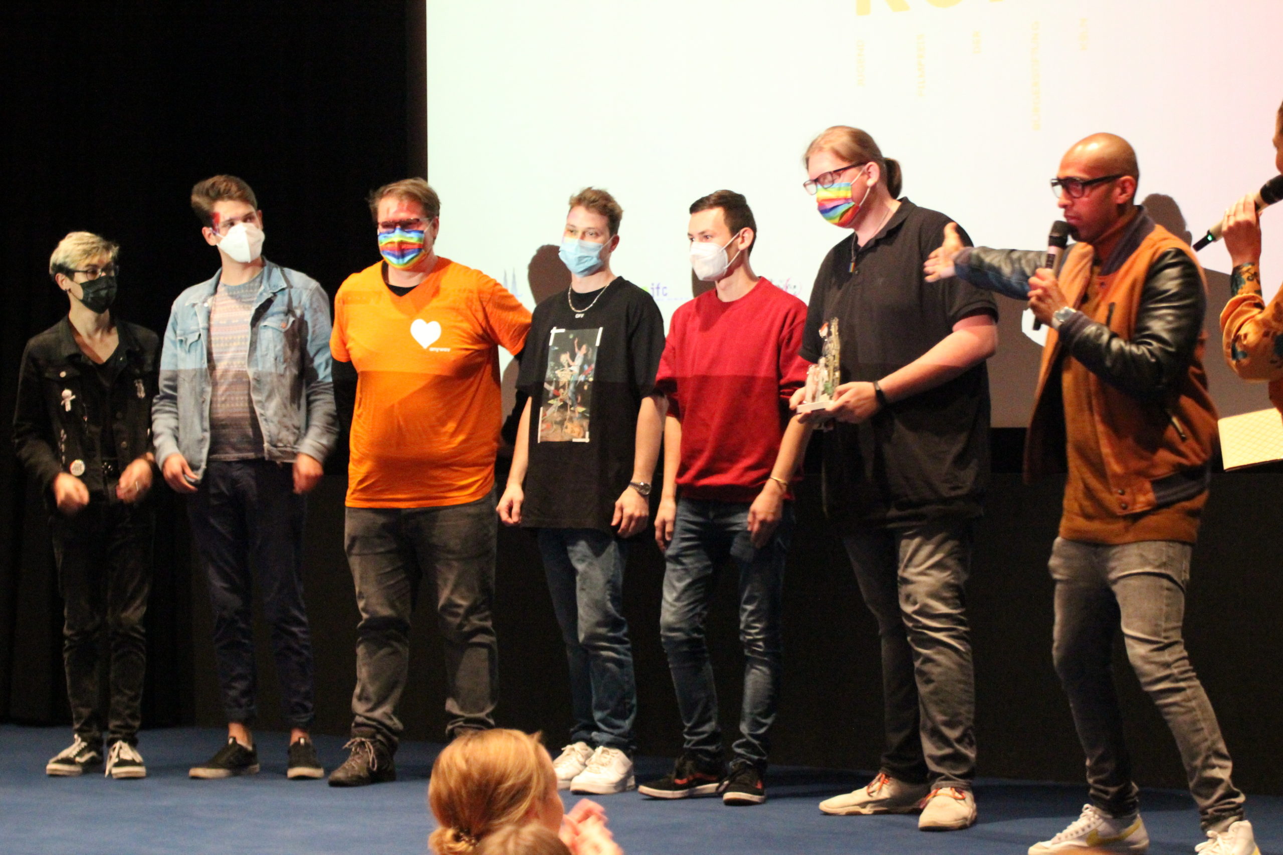 Fernsehmoderator Amiaz Habtu, Mitglied der Jury bei „Köln Kurz 2021“, überreichte den Publikumspreis an den Beitrag „Wir alle gemeinsam“ von Marcel, Felix, Max, Nina und Tom. Ihre Vision für „ihr“ Köln morgen ist eine Stadt, in der niemand aufgrund seiner sexuellen Orientierung oder geschlechtlichen Identität ausgegrenzt oder benachteiligt wird.