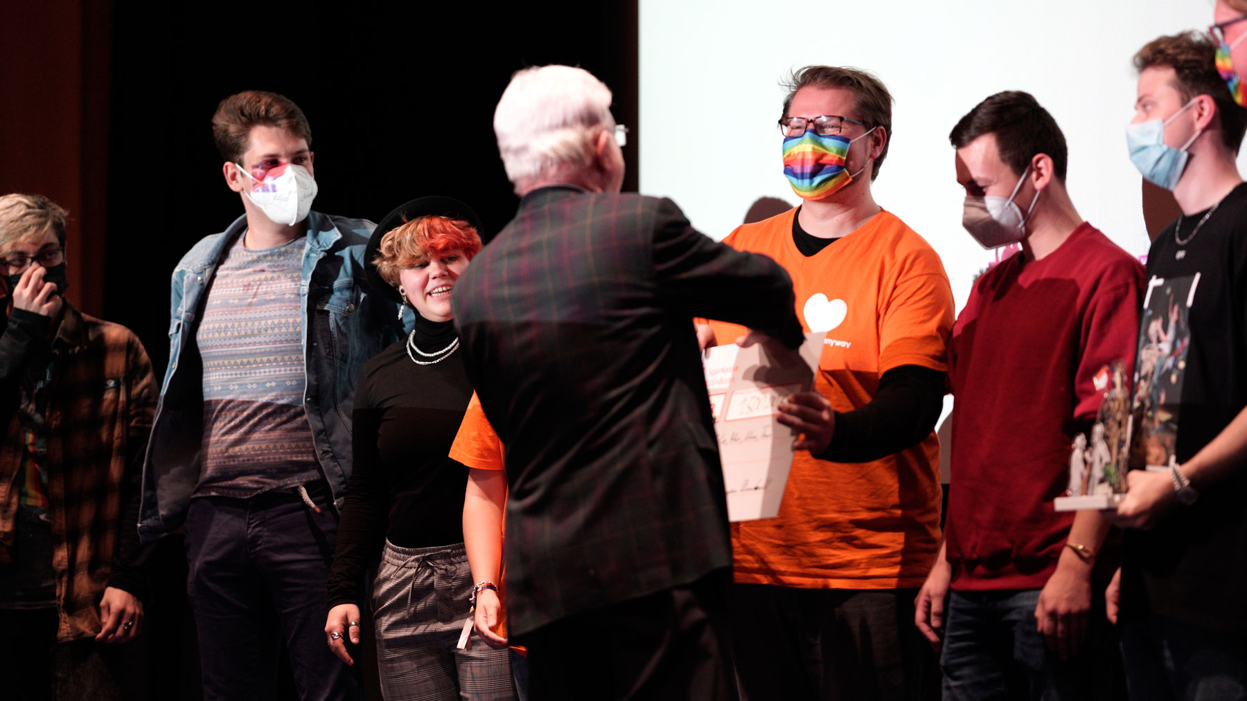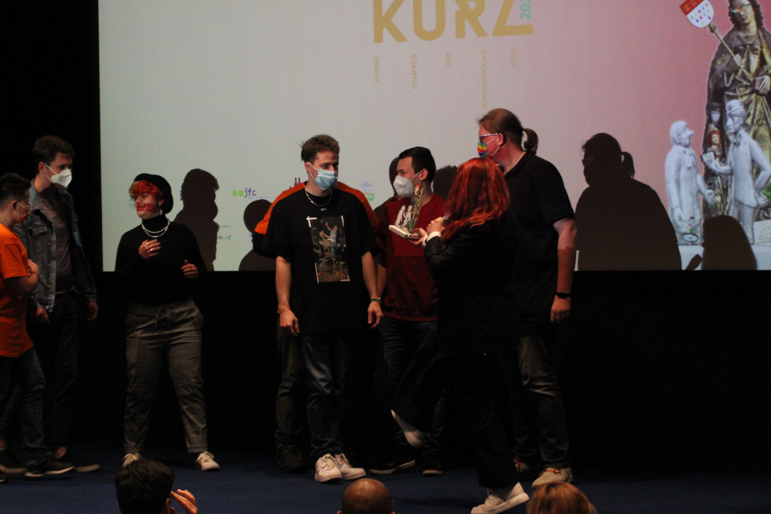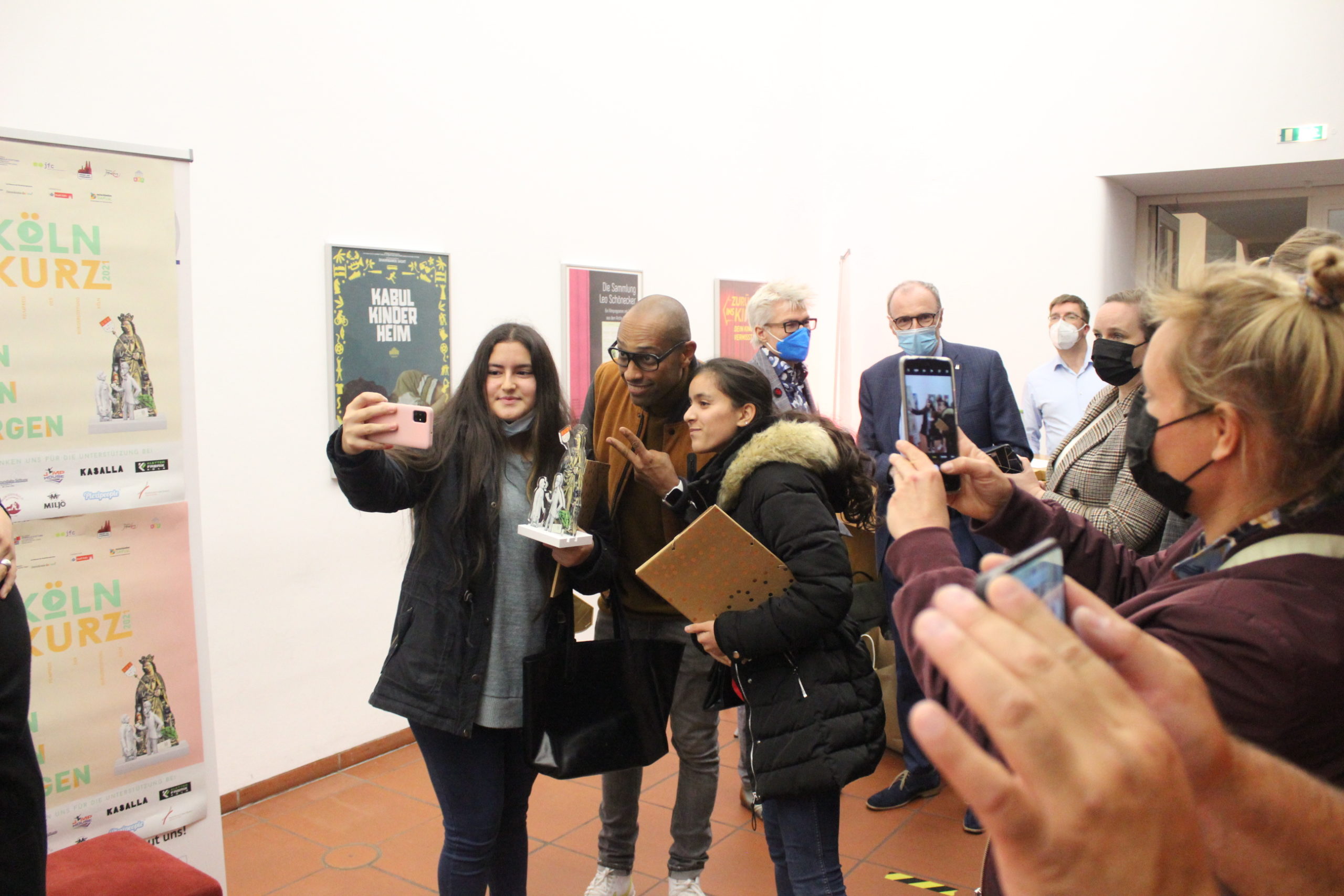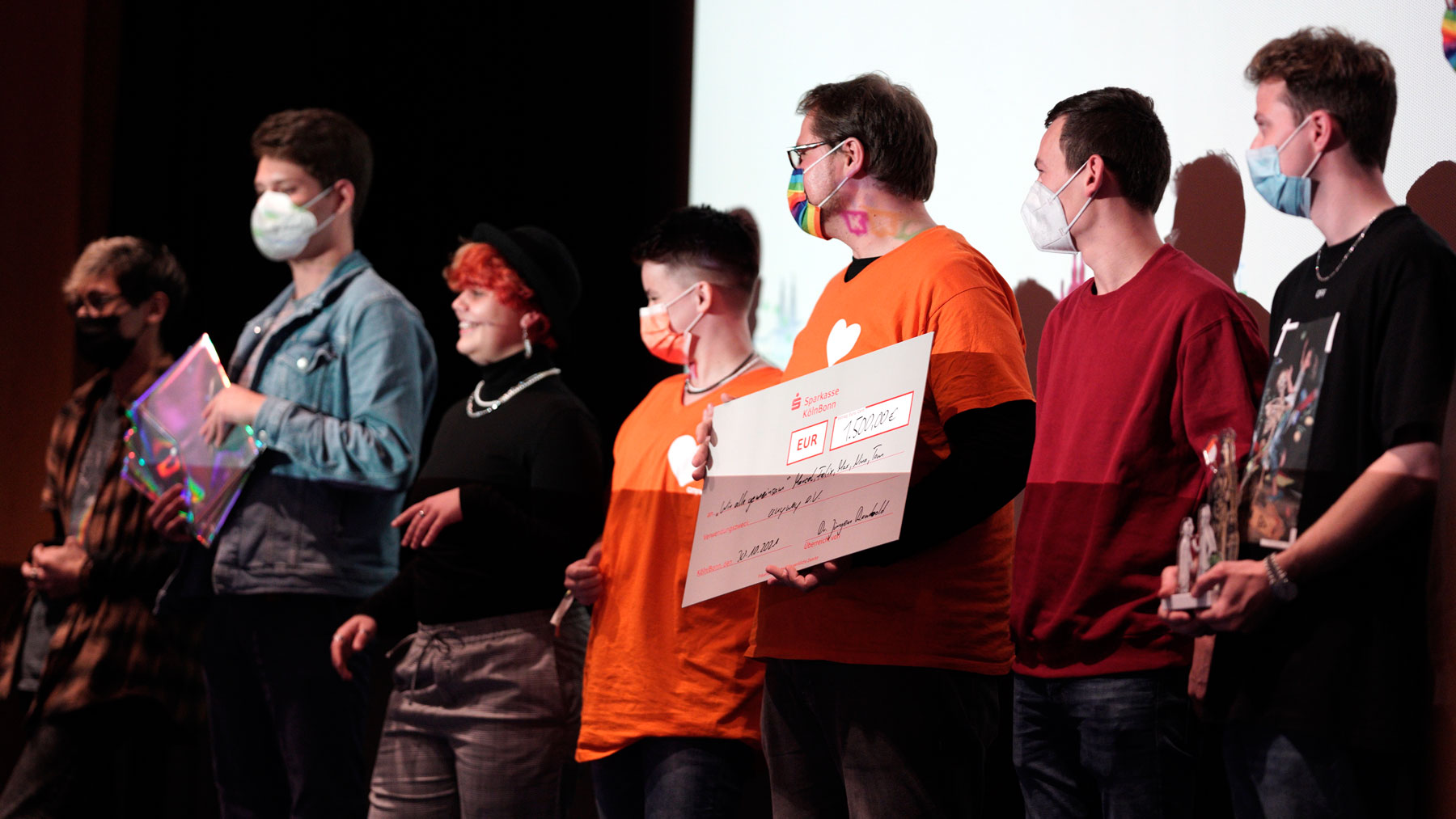 Fernsehmoderator Amiaz Habtu, Mitglied der Jury bei „Köln Kurz 2021“, überreichte den Publikumspreis an den Beitrag „Wir alle gemeinsam“ von Marcel, Felix, Max, Nina und Tom. Ihre Vision für „ihr“ Köln morgen ist eine Stadt, in der niemand aufgrund seiner sexuellen Orientierung oder geschlechtlichen Identität ausgegrenzt oder benachteiligt wird.