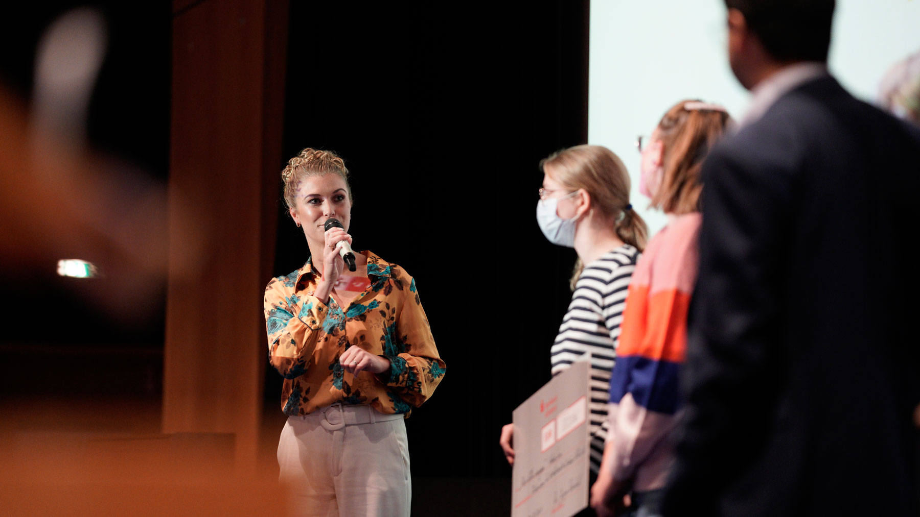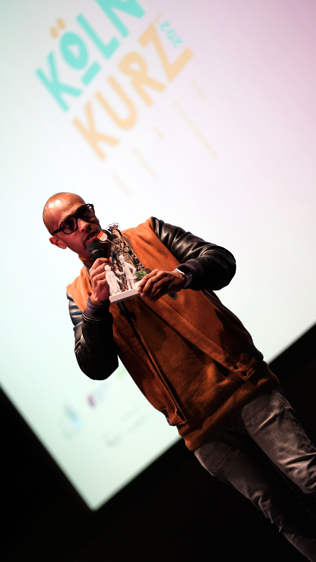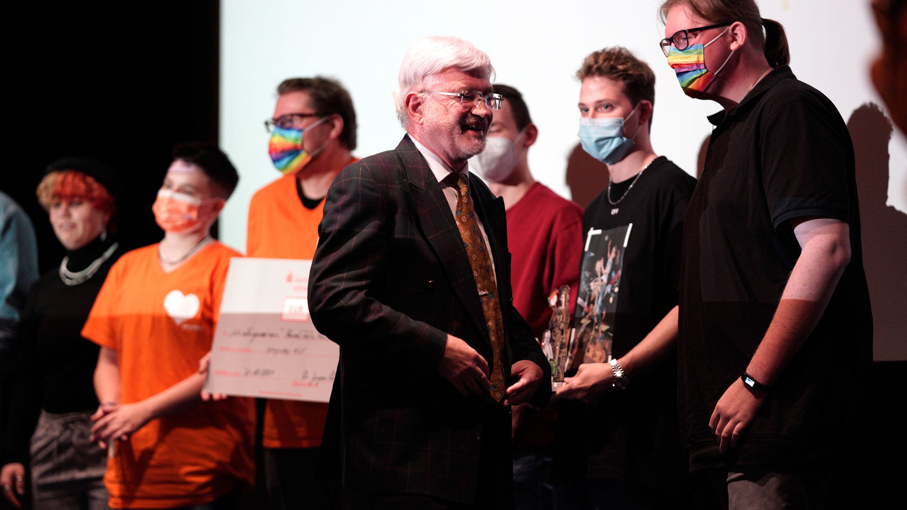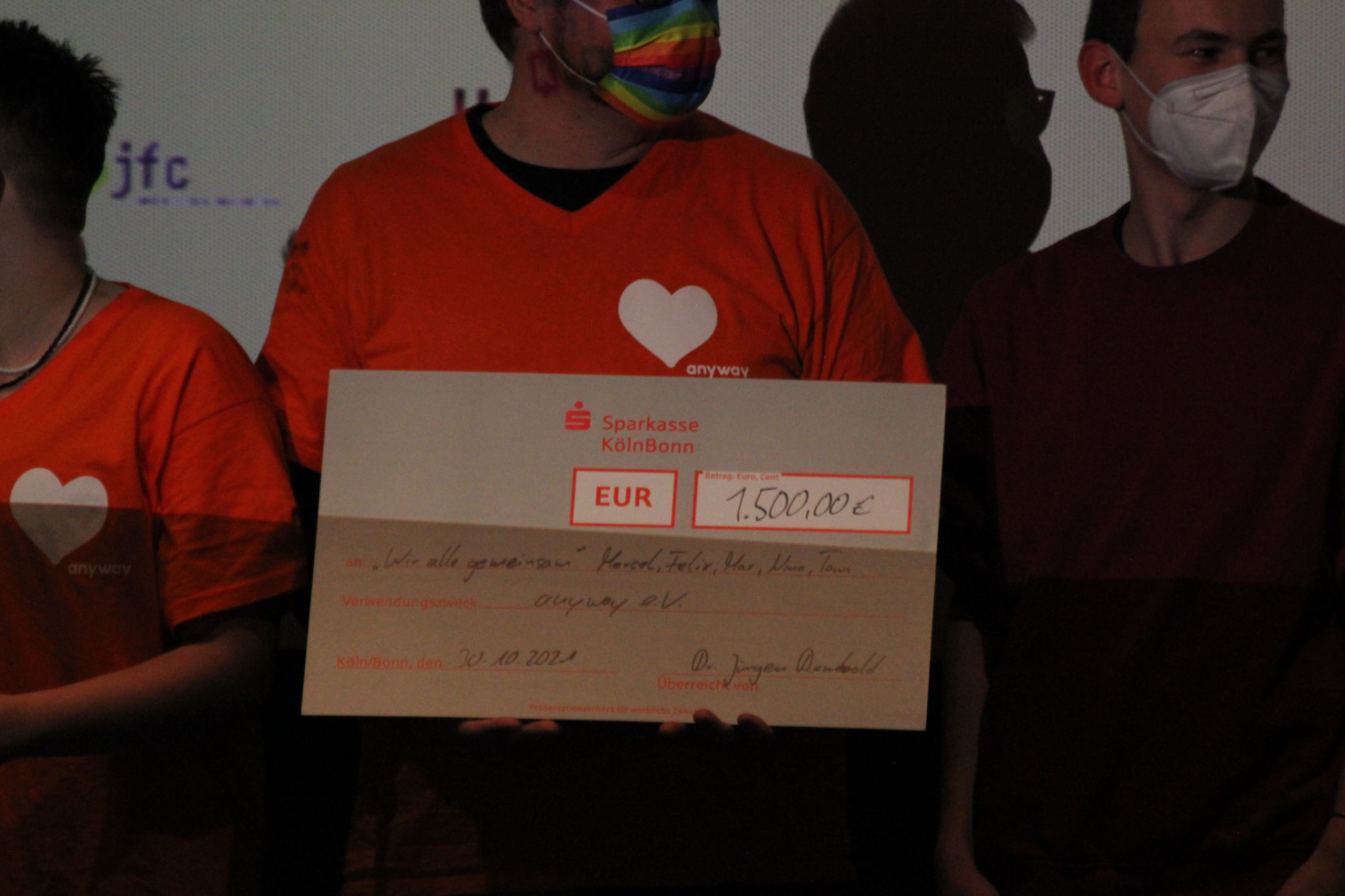 Fernsehmoderator Amiaz Habtu, Mitglied der Jury bei „Köln Kurz 2021“, überreichte den Publikumspreis an den Beitrag „Wir alle gemeinsam“ von Marcel, Felix, Max, Nina und Tom. Ihre Vision für „ihr“ Köln morgen ist eine Stadt, in der niemand aufgrund seiner sexuellen Orientierung oder geschlechtlichen Identität ausgegrenzt oder benachteiligt wird.
