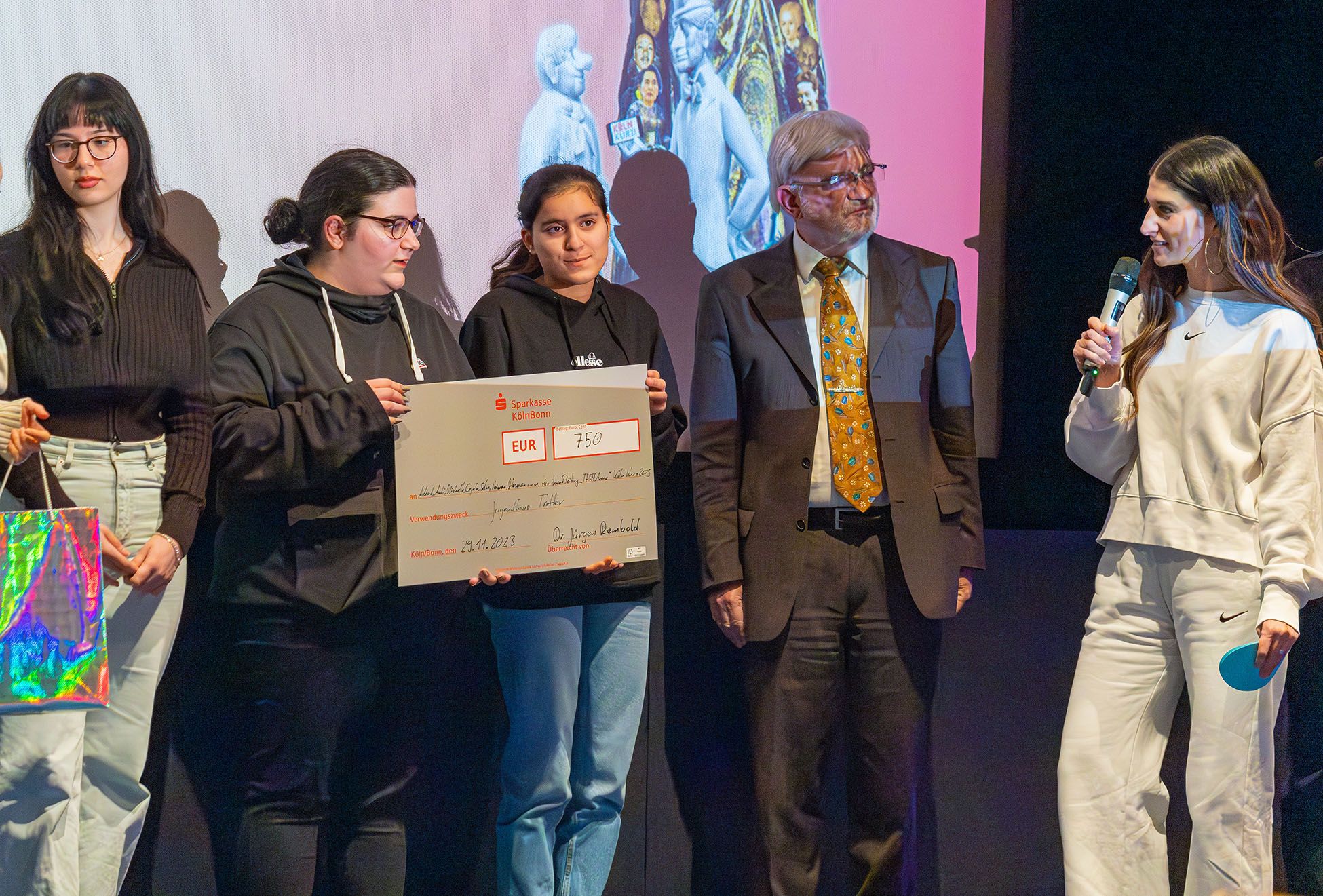 Der Beitrag „Raum für Träume“ von Nicole, Keta und Pia erreichte Platz 2 in der Alterskategorie „16+ Jahre“. „,Raum für Träume‘ überzeugt vor allem mit einem starken, gefühlvollen Text“, würdigte Laudatorin Lisa. Den gemeinnützigen Anteil dachten die drei Mädchen der Diakonie Michaelshoven zu. Den Scheck nahm Herbert Reitinger, Leiter der Kundenbetreuung bei der Diakonie Michaelshoven, in Empfang.